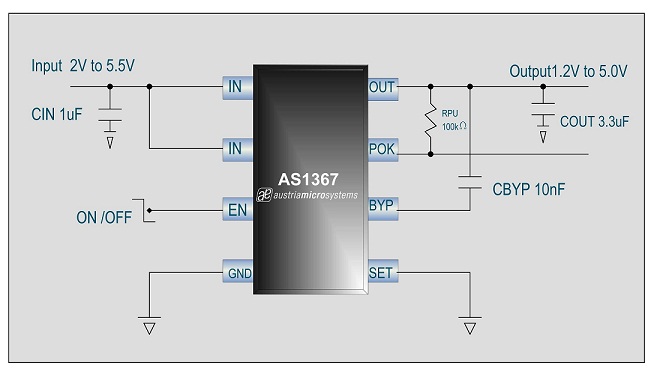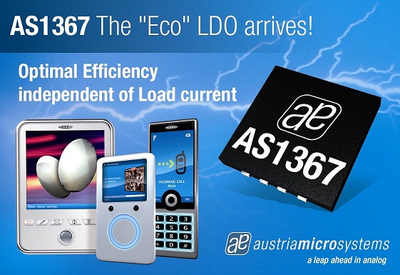 中國——全球領先的通信、工業、醫療和汽車領域模擬集成電路設計者及制造商奧地利微電子公司(SWX 股票代碼:AMS)擴展旗下低壓差穩壓器產品線,推出“Eco”LDO AS1367,在穩壓輸出時可提供高達150mA的電流。