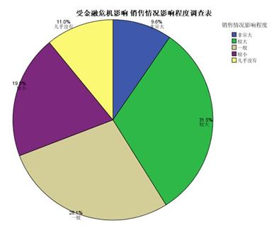 受金融危機的影響,銷售情況影響程度非常大的公司比重占9.6%,影響較大的為31.5%,幾乎沒有影響的只有11.0%(如下圖:受金融危機影響銷售情況影響程度調查表)。