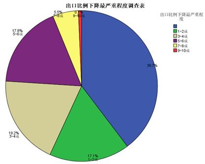 金融風暴,全球經濟重創,對出口為主的企業影響最為慘重,尤其是對于以出口為導向的我國行業企業,損失慘重。數據顯示,受金融危機影響,出口比例下降最嚴重程度5-6成者比重最大,占17.8%,下降1-2成者比例也不低,占17.1%(如下圖:出口比例下降最嚴重程度調查表。備注:藍色部分39.7%比例為單一內銷型企業)。