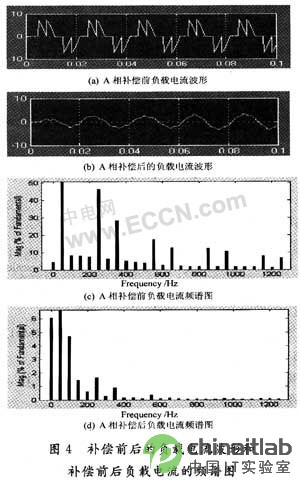 為了驗證上述諧波檢測和控制方案的有效性以及由此構成的基于DSP的并聯型有源電力濾波器是否能很好地補償諧波和無功電流,本文進行了實驗。采用阻性負載作為三相不控橋式整流器的負載,試驗中在負載側接了1個2Ω的電阻。下面以A相為例給出實驗波形。圖4分別給出了補償前后的負載電流波形和補償前后負載電流的頻譜圖。