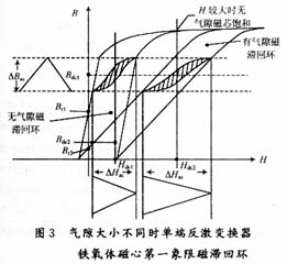 與正激開關電源變壓器不同,此反擊電源變壓器兼有儲能的作用,流過直流電流成分時容易飽和。所以要使用帶有氣隙的磁芯。原理如圖3所示。