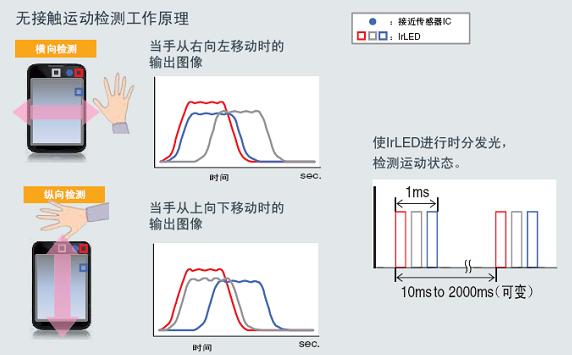 Rohm公司的另一個重要的產(chǎn)品是單片光學(xué)式接近傳感器/照度傳感器芯片BH1771GLC。Rohm公司設(shè)計中心所長福田明介紹,“BH1771GLC在單芯片上安裝有檢測可見光的光電二極管和檢測紅外光的光電二極管,在感知1cm ~ 10cm 程度的接近的同時,作為照度傳感器可以檢測0 ~ 65,000Lux。而且,擴大距離傳感器功能,安裝了業(yè)界首創(chuàng)無接觸動作檢測功能。所謂無接觸動作檢測,即以BH1771GLC驅(qū)動多個紅外線LED(最多3 個),檢測各個LED 的反射光相位偏差,并感知反射物(人的手)的動作方向的功能。如果使用這一功能,不需要直接接觸顯示器,在距離顯示屏5cm 左右的高度通過揮手動作也能操作。借此,即使沒有安裝觸摸顯示屏的顯示器設(shè)備也可以進行動作操作。”可以想象,采用該方案過后,不用接觸屏幕或按鍵就可以實現(xiàn)翻頁、換歌,或瀏覽網(wǎng)頁的功能,這對手機制造商來說無疑是個絕佳的創(chuàng)新賣點。