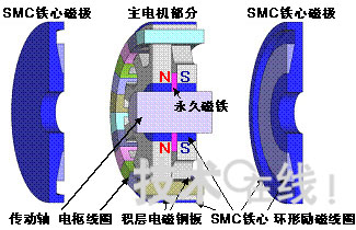 為了有效協(xié)調(diào)兩種磁鐵,名古屋工業(yè)大學(xué)采用了SMC(Soft Magnetic Composites=軟磁性復(fù)合材料)鐵心。SMC鐵心是對(duì)鐵粉等帶有磁性的粒子表面被覆絕緣層,并壓縮成形和經(jīng)熱處理而制成。能夠以低成本量產(chǎn)和成形具有復(fù)雜三維構(gòu)造的磁性部件。