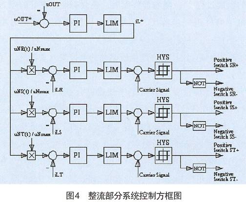 如圖4所示,系統的給定是直流母線電壓指令,這個指令與直流母線電壓反饋的誤差送到電壓環的PI調節器。電壓環的PI調節與三相輸入正弦波的乘積成為三相電流的指令,三相電流指令與各自電流所饋作比較,誤差送到電流環的PI調節器。電流環PI調節器的輸出可以通過載波調制產生各相IGBT的PWM控制信號,也可以通過空間矢量的方式產生PWM信號控制IGBT。上述的運算都是通過DSP完成的。