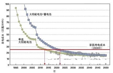 如同人們經常指出的,太陽能發電確實也有缺點:下雨時輸出會很低,在陰天及其他情況時會有大幅波動,而且在夜晚時為零。然而,透過使用蓄電池后可以克服大部分的問題。如果配有蓄電池的太陽能發電系統達到與市電同價后,將會有很大的沖擊(其中包括減少石化燃料消耗)。日本經濟產業研究所(RIETI)已預估大約2022年,配有蓄電池的家用太陽能發電系統將達到與市電同價(圖10)。