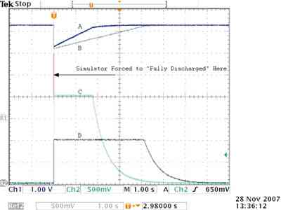 圖3為模擬鋰離子電池充電至4.2V時獲得的典型V-I波形。從圖中可以看出兩個測試過程:一個是以1A初始快充電流充電(曲線B和D),另一個是以2A快充電流充電(曲線A和C)。這兩種情況下,首先進入CC階段充電,直到電池電壓達到終止電壓4.2V。在此之后,電流呈指數衰減,而仿真電池的電壓保持不變。充電電流為2A時到達終止電壓所需的時間更短,與預期設計相同。然而,請注意,電流加倍不會使充電時間減半,只會使到達CV模式的時間減半,與真實電池負載的測試情況一樣。