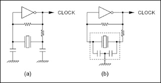 圖1給出了兩個皮爾斯振蕩器的實例。圖1a是一個典型的晶體振蕩電路,使用外部電容和電阻。圖1b則是一個基于三端陶瓷諧振器的皮爾斯振蕩器,陶瓷諧振器中集成了補償電容。這些設計中的每一個元件的值與工作頻率、供電電壓、反相器的類型、元件類型(晶體或諧振器)以及制造商有關。