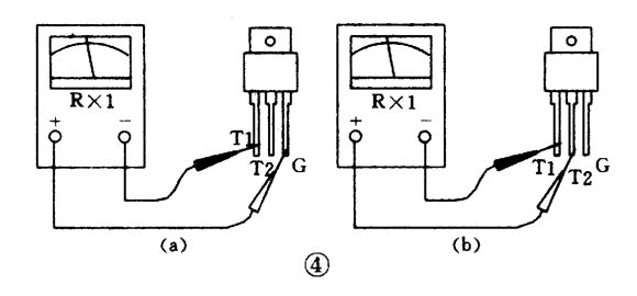 (2)把黑表筆接T1極,紅表筆接T2極,電阻為無窮大。接著用紅表筆尖把T2與G短路,給G極加上負觸發信號,電阻值應為十歐左右(參見圖4(a)),證明管子已經導通,導通方向為T1一T2。再將紅表筆尖與G極脫開(但仍接T2),若電阻值保持不變,證明管子在觸發之后能維持導通狀態(見圖4(b))。