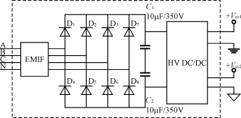 這種供電方式體積和重量較大,成本也較高,顯然按以上電路連接時,對三相四線供電時不能缺零線,對三相三線供電時不能缺公共地線,如B相;另外,有的供電局用戶要求,三相電度表輸入端任意兩線有電壓輸入時都能工作,則圖5的設計便不能達到目的;當采用三相電度表專用開關電源模塊供電時,可解決以上問題,其內部結構圖如圖6所示。