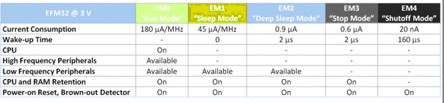 Cortex - M3的另一個顯著優勢是它提供了先進的睡眠模式,在EFM32里得到了進一步增強。由于這些設備在睡眠模式下花掉了大多數的運行壽命,在睡眠模式下提供盡可能多的靈活度很有意義。EFM32提供5種睡眠模式, 運行模式(EM0)花費了180μA/MHz而關斷模式只花費20nA(EM4)。