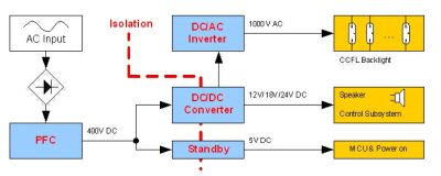 圖3是傳統式LCDTV電源的結構框圖,按照功能通常可將其劃分為3大模塊,即:PFC模塊、DC/DC主電源模塊、DC/AC逆變電源模塊。
