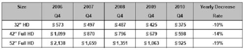 表3:DisplaySearch對LCDTV成本的近年數據統計及未來走勢預測。
