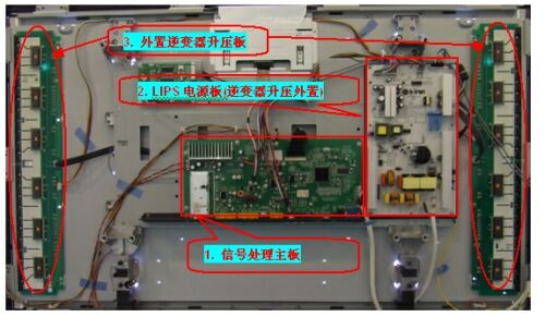 圖2:傳統式LCDTV內置信號處理、AC/DC電源、DC/AC電源三塊PCB板。