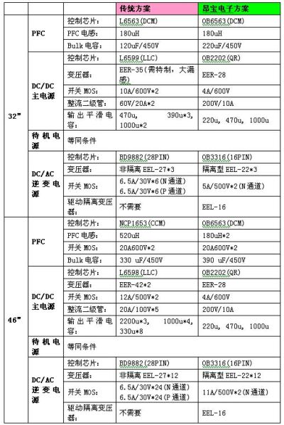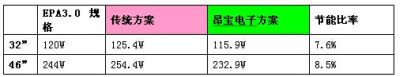 以某知名品牌32"與46"LCDTV進行對比,昂寶電子所開發的LCDTV整體電源解決方案在整體功耗及關鍵零件數量方面均比傳統電源方案有明顯的優勢: