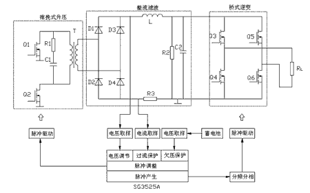 本逆變器輸入端為汽車蓄電池(+12V,4.5Ah),輸出端為工頻方波電壓(50Hz,220V)。其系統(tǒng)主電路和控制電路框圖如圖1所示,采用了典型的二級(jí)變換,即DC/DC變換和DC/AC逆變。12V直流電壓通過推挽式變換逆變?yōu)楦哳l方波,經(jīng)高頻升壓變壓器升壓,再整流濾波得到一個(gè)穩(wěn)定的約320V直流電壓;然后再由橋式變換以方波逆變的方式,將穩(wěn)定的直流電壓逆變成有效值稍大于220V的方波電壓,以驅(qū)動(dòng)負(fù)載。為保證系統(tǒng)的可靠運(yùn)行,分別采集了DC高壓側(cè)電壓信號(hào)、電流信號(hào)及蓄電池電壓信號(hào),送入SG3525A,通過調(diào)整驅(qū)動(dòng)脈沖的占空比或關(guān)斷脈沖來實(shí)現(xiàn)電壓調(diào)節(jié)、過流保護(hù)及欠壓保護(hù)等功能。