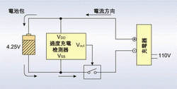 過度充電保護IC的原理為:當外部充電器對鋰電池充電時,為防止因溫度上升所導致的內壓上升,需終止充電狀態。此時,保護IC需檢測電池電壓,當到達4.25V時(假設電池過充點為4.25V)即激活過度充電保護,將功率MOSFET由開轉為切斷,進而截止充電。