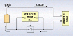 因不明原因導致短路時必須立即停止放電。過電流的檢測是以功率MOSFET的Rds(on)為感應阻抗,以監視其電壓的下降,此時的電壓若比過電流檢測電壓還高時即停止放電。為了使功率MOSFET的Rds(on)在充電電流與放電電流時有效應用,需使該阻抗值盡量低,目前該阻抗約為20mΩ~30mΩ,這樣過電流檢測電壓就可較低。