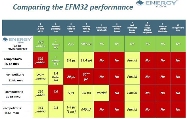 圍繞節(jié)能的ARM ® Cortex™- M3處理器架構(gòu),Giant Gecko, Gecko 和Tiny Gecko微控制器的使用證明它們可比8 - ,16 - 或32位微控制器節(jié)能四分之一。 這些微控制器具有僅為2μs的喚醒時間和MHz執(zhí)行代碼下每閃存 180μA的電流消耗,深度睡眠模式下為900nA, 關閉模式下為20nA, 這些微控制器被證明有能力延長300%的標準電池壽命。[page]
