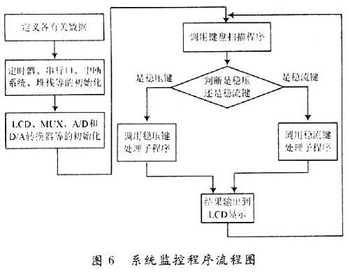 軟件部分的設計包括A/D轉換器、D/A轉換器、LCD顯示器、鍵盤系統等功能的子程序,還包含系統監控程序和各種中斷服務程序等,其系統監控程序流程圖如圖6所示。