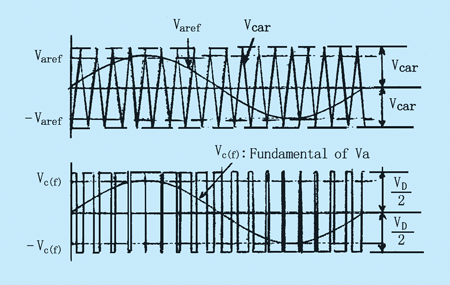 為產生任意波形的交流電壓,將PWM技術應用到直流母線電壓斬波的電壓源逆變器上。現有很多能組成正弦波或任意波形的PWM技術,利用PWM技術,不僅允許控制逆變器作為電壓源,也可作為電流源以控制濾波器的交流輸出。圖2為所利用的最普通的三角載波(TC)技術,這是最簡單的線性控制方法,是將有固定幅值的和固定三角波的輸出電流誤差進行比較。迫使開關周期內的輸出電壓Va限定于Vcar的載波周期內,并等于調制波Varef的平均幅值。正弦調制波的合成電壓含正弦基波分量Va(f)和不希望的諧波分量,利用盡可能高的頻率載波,可使這些不想要的諧波成分減到最小,但這取決于半導體功率器件(IGBT、GTO或IGCT)的最大開關頻率。