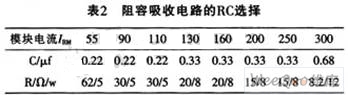 模塊過壓保護一般也可采用阻容吸收法。對于持續時間較短,能量不大的過電壓,一般可在模塊兩端并聯阻容吸收電路,用吸收電容把過電壓的電磁能量變成靜電能量存貯起來。而用吸收電阻不但可以防止電路振蕩,還可限制晶閘管導通時電容放電所產生的開通損耗和di/dt值。并聯在晶閘管開關模塊的RC值可參考表2。