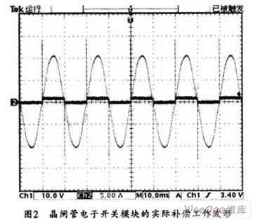 在無功補償實際應用中,可將晶閘管電子開關模塊用在TSC低壓無功補償以替代接觸器,這樣,就可以在開關電壓過零時投入補償電容量,從而避免了沖擊電流的產生和瞬間電網電壓的波動。圖2所示是其工作波形圖。