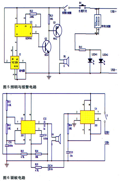 如圖5所示,當按下預報警功能鍵時,USB輸出電壓加載在報警系統上,此時移動隨身電源處于"預報警"狀態。當水銀開關B1位置偏移正常的斷開位置,將觸發繼電器工作,使KD9561音樂片工作,發出報警響聲,提醒注意安全。