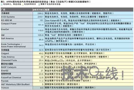 在奧巴馬政權的經濟刺激政策“ARRA”的7872億美元中,美國能源部(DOE)將其中的14億9190萬美元用于電動車輛用充電電池的生產(表2)。利用該ARRA投資的條件是,接受投資的企業需要自行準備與投資額大致相同的資金,因此共計有約30億美元的資金用于電池生產。