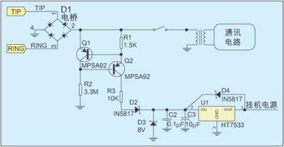 在掛機狀態下有多種饋電方式,恒流源配合線性穩壓電路的饋電方式是常用的一種,圖1給出了這種饋電方式的電路結構。在該電路中,電橋用來做極性保護,其后的一個恒流源電路與通訊電路并接。電流大小基本由R1決定,約為300uA,這是為了在保證掛機電源供應的同時,不會因為漏電過大而導致交換機方誤判電話終端故障。由于電流太小,所以無法使用效率更高的開關電源。通訊電路一般采用變壓器耦合以消除對地的不平衡,但如果電路允許,也可采用通訊電路與電橋共地的連接方式來簡化電路。