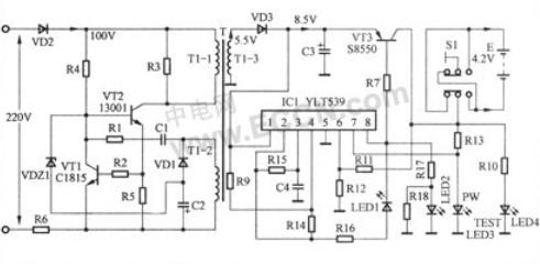 該電路主要由一塊軟塑封集成塊IC1(YLT539)和三極管VT3等組成。從變壓器T的1-3繞組感應(yīng)出的交流電壓5.5V經(jīng)二極管VD3整流、電容C3濾波后,輸出一個(gè)直流8.5V左右電壓(空載時(shí)),該電壓一部分加到三極管VT3的e極;另一部分送到軟塑封集成塊IC1(YLT539)的1腳,為其提供工作電源。集成塊IC1有了工作電源后開始啟動工作,在其8腳輸出低電平充電脈沖,使三極管VT3導(dǎo)通,直流8.5V電壓開始向電池E充電。