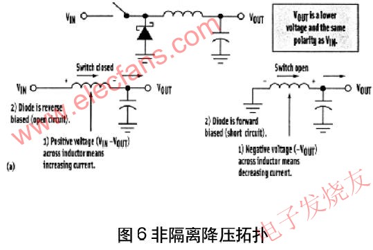 降壓變換器是構成大多數開關變換器架構基礎的基本拓撲。它是最通用的拓撲,在分布電源系統中會用到這種拓撲,因為必須變換高dc電壓(48V)到較低的電壓,而且功耗小。開關是一個功率晶體管(通常是MOSFET),其柵極由執行脈寬調制(PWM)的IC驅動它控制占空比(晶體管的開關時間),從而控制輸出電壓大小。圖6示出非隔離降壓拓撲。