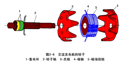 轉(zhuǎn)子軸上壓裝著兩塊爪極,兩塊爪極各有六個鳥嘴形磁極,爪極空腔內(nèi)裝有磁場繞組(轉(zhuǎn)子線圈)和磁軛。集電環(huán)由兩個彼此絕緣的銅環(huán)組成,集電環(huán)壓裝在轉(zhuǎn)子軸上并與軸絕緣,兩個集電環(huán)分別與磁場繞組的兩端相連。