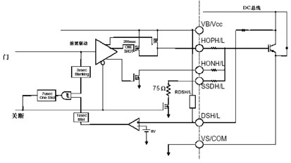在DSH/L針腳提供主動式偏壓結構,目的是降低IGBT處于OFF時流過二極管寄生電容和內部上拉電阻電流的噪聲效應。DSH/L給VB/VCC提供相應的主動式上拉,給VS/COM提供相應的下拉。當電壓超過VDESAT臨界電壓的時候,專用偏壓電路可以降低DSH/L針腳的阻抗。當IGBT處于完全開啟的時候,感測二極管變為順偏,DSH/L針腳上的電壓就下降了。這時,偏壓電路不再起作用,目的是降低二極管的偏壓電流。