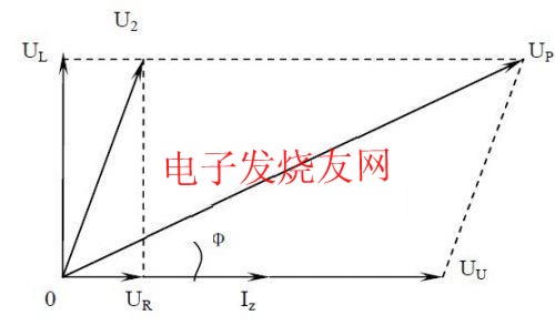 光伏發電并網運行時的電路原理如圖2所示。Up為逆變器輸出電壓,Uu為電網電壓,R為線路電阻,L為串聯電抗器,Iz則為回饋電網的電流。為保證回饋功率因數為1,回饋電流的相位必須與電網電壓的相位一致。以電網電壓Uu為參考,則Iz與Uu同相位,其矢量圖如圖3所示。內阻R兩端的電壓UR與電網電壓相位一致,而電抗器兩端電壓UL的相位則落后于UR90º.由此可以求得UP的相位和幅值: