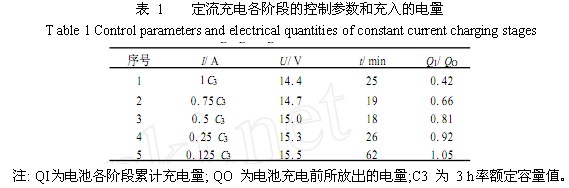 (2) 減小各段恒流值下降梯度 。通過試驗確定該型電池初次恒流值I (1) ,并減小階段恒流充電的電流下降幅度 。如果降低充電電流后 ,達到充電終止容量梯度值的時間很短 (設(shè)定一個最小充電時間) ,則適當(dāng)增大電流下降的幅度 。