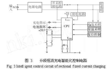 分段恒 流 充 電 智 能 化 控 制 電 路 如 圖3 所示。該電路采用 CPU 控制 ,可對充電電池和充電環(huán)境溫度進行檢測 ,對電池充電進行計時 ,采樣充電過程中電池的電壓和電流 ,對分段恒流充