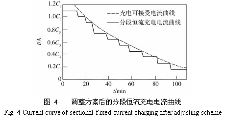 根據(jù)調(diào)整后的分段恒流充電方案進行充電試驗 ,為便于比較 ,采用與方案調(diào)整前的充電試驗所用同一型號電池 ,充電初始狀態(tài)完全一樣。調(diào)整方案后的定流充電各階段的控制參數(shù)和充入的電量如表 3 所示 ,其定壓充電階段的控制參數(shù)和充入的電量與表的分段恒流充電電流曲線如圖 4 所示。