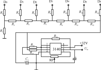 這需要將計數(shù)器的二進制數(shù)轉化為電壓。顯然用D/A轉換是可以的,但電路復雜程度上升,成本也有所提高。故為了簡化電路我們僅借用D/A轉換網絡的思想,利用權電阻T形網絡將4516的7位數(shù)值變換成模擬量輸出,推動電壓表指示,見圖5。