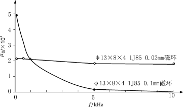 共模電感是完全對稱、線圈匝數相同的兩個電感線圈,繞在同一個鐵心上,電流同方向流經兩組線圈后,根據右手螺旋法則,在電感鐵心內產生兩個方向相反的磁場,由于流經電流大小,線圈匝數完全相同,磁場強度強弱相當,因而完全抵消,不存在磁飽和問題,主要是要考慮電感鐵心材料的初始磁導率μo,對于這類材料的μo越高越好,通常有高μo系列的鐵氧體磁心,μo=4×103,6×103,8×103,1×104等類型,鐵基超微晶材料μo≥5×104,坡莫合金系列如1J79,1J851系列,μo≥5×104。在選擇金屬磁性材料時必須注意頻響問題(見圖3)1J79或1J851系列的磁心μo隨頻率上升而下降的幅度比較大,越薄的材料,μo隨頻率下降的幅度比較小,設計時應注意這一點。