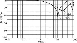 但是值得商榷的是,可選擇作為濾波器的差模電感的磁粉心不僅僅是μe=75鐵粉心一種,圖5是鐵粉心系列μe=75,μe=55,μe=35磁導率隨頻率變化的曲線,可見它們磁導率隨頻率上升而下降的趨勢不同。圖6是MICROMETARS公司-8(μe=35)和上海鋼研精密合金器材研究所SF-33(μe=37.5)鐵粉心材料的插入損耗曲線,可見吸收峰出現在不同的頻率范圍內,因此除了考慮電感量大小,磁飽和問題,價格等因素外,還應該考慮抑制噪聲的頻率范圍,來選擇不同型號的鐵粉心。