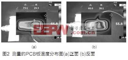 熱源器件的功耗分析、熱源器件的熱距離布局面積計(jì)算以及熱源器件的環(huán)境溫度分析都完成后就可以開始PCB的布局了,PCB的布局需要遵循最基本的熱設(shè)計(jì)原則,如:熱點(diǎn)分散;將最高功耗和發(fā)熱最大的器件布置在散熱最佳位置;不要將發(fā)熱較高的器件放置在印制板的角落和四周邊緣;高熱耗散器件在與基板連接時(shí)應(yīng)盡能減少它們之間的熱阻等,另外還要按照上面計(jì)算的壓縮熱間距布放熱源器件,在熱源器件的壓縮熱間距內(nèi)盡量少布器件,更不能布放發(fā)熱器件,熱源器件的背面也要盡量少布器件,更不能布放發(fā)熱器件。圖1為本項(xiàng)目的最終PCB版圖,圖2為其溫度測(cè)量圖。由圖可見,本設(shè)計(jì)方法是實(shí)用的。