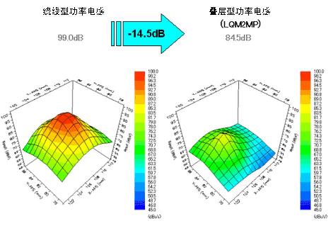 圖6顯示了繞線型功率電感和疊層型功率電感的磁束泄漏監測數據。與一直以來作為DC-DC轉換器上使用的主要功率電感的繞線型功率電感相比,疊層型功率電感的磁束泄漏更少,現已證實閉合磁路的構造使磁束泄漏較少。這些數據表明在小型高速開關DC-DC轉換器電路中使用小型疊層型功率電感的情況下,能夠發揮它抗噪特性的特長。