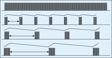突變模式技術又稱打嗝模式(hiccupmode)或周期省略模式(圖3)。在負載很大情況下,回掃電路根據輸出電壓變化來調制脈沖寬度。當負載降低到一定程度時,控制電路將維持原有脈沖寬度,轉而周期性跳過部分脈沖,控制電路通過降低總脈沖寬度或增加遮蔽周期長度達到降低損耗的目的。該技術有兩個明顯的缺點,即低頻干擾會和遮蔽周期一起出現,而且負載突然改變也會造成輸出電壓突降。