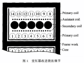 本文討論的電路中還存在前級電路和次級電路的輔助電源,它們也是由繞在變壓器上的獨立線圈提供能量的。這兩級輔助線圈的存在給噪聲電流的傳播提供了額外的途徑。輔助線圈是為了控制電路的供電設計的。盡管控制電路本身的功率很小,但它們的存在卻增大了電路對地的寄生電容,從而分擔了一部分把共模噪聲從活躍節(jié)點耦合到地的工作。然而把這些繞組夾在前級線圈和次級線圈的繞組中間就能增大前后級繞組的距離,從而它們的層間寄生電容就減小了,噪聲電流就能相應減小。因此,變壓器繞制的最終方法應如圖4所示。從內到外的線圈繞組依次是:前級繞組的一半、輔助繞組的一半、后級繞組、輔助繞組的另一半和前級繞組的另一半。