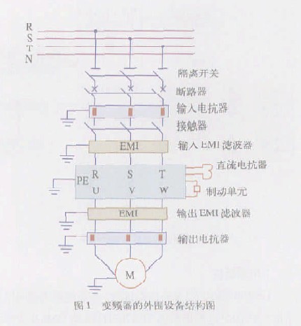 變頻器外圍保護設備的組成為了提高變頻器的工作性能,實現變頻器和電動機的保護,減少變頻器和周圍其他電氣設備的相互影響,在變頻器的輸入、輸出端配備的外圍保護設備如圖1 所示。