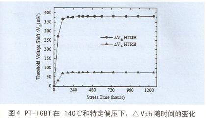 (2) PT—IGBT在高溫柵偏壓下閾值電壓漂移。圖4給出PT—IGBT(IRG4BC20F)在(1)柵已射極Gge=20V,Vce=OV(HTGB)和(2)Vge=0V,Vce=0.8V(HTRB)在140℃,經過1200小時的應力試驗結果。由圖4中的HTGB曲線可見,柵偏置試驗開始后100小時內,