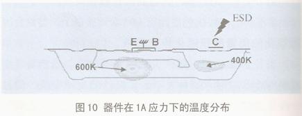 圖10是1A電流應力下,模擬顯示該器件有兩個熱點。一個在收集極觸點下,損傷電流IT2=1.52A;另一個熱點在發射極之下,用外推法算出的損傷電流遠大于2A。所以,首先出現導致失效的硅熔融點應在收集極。