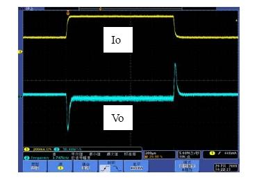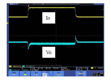 系統(tǒng)的帶寬是影響系統(tǒng)動(dòng)態(tài)響應(yīng)的重要因素,相位裕度是影響系統(tǒng)穩(wěn)定性的重要因素。如果選擇不同的Rf1,系統(tǒng)的帶寬和相位裕度會(huì)產(chǎn)生變化,也就是動(dòng)態(tài)響應(yīng)和穩(wěn)定性會(huì)發(fā)生變化。具體以表1來分析,當(dāng)Rf1從300k變到750k,系統(tǒng)地帶寬從51.1kHz變到26.1kHz,因此系統(tǒng)的動(dòng)態(tài)響應(yīng)會(huì)相應(yīng)的變差,而由于相位裕度都是足夠的,因此系統(tǒng)都處于穩(wěn)定工作的狀態(tài)。圖7和圖8是做負(fù)載切換的動(dòng)態(tài)響應(yīng)測試結(jié)果,從測試結(jié)果可以看出環(huán)路響應(yīng)速度變慢,導(dǎo)致輸出電壓過沖變大,動(dòng)態(tài)響應(yīng)效果變差。