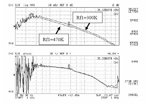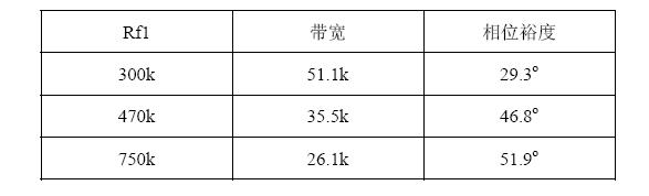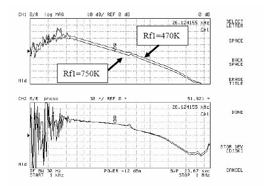 圖5和圖6是用網(wǎng)絡(luò)分析儀進(jìn)行AP3406環(huán)路增益測試的結(jié)果。由圖可以看出,當(dāng)Rf1從300k變化到470k,再變化到750k,系統(tǒng)的環(huán)路增益的幅頻特性不斷向下移動(dòng),同時(shí)相頻特性基本不變。于是系統(tǒng)的帶寬和相位裕度都有較大改變,測試結(jié)果如表1所示。