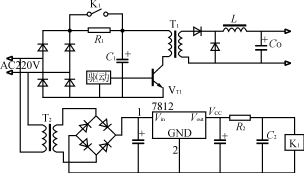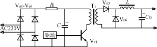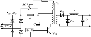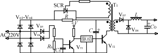 該電路如圖3所示。在電源瞬時接通時,輸入電壓經整流橋VD1VD4和限流電阻R對電容器C充電。當電容器C充電到約80%的額定電壓時,逆變器正常工作,經主變壓器輔助繞組產生晶閘管的觸發信號,使晶閘管導通并短路限流電阻R,開關電源處于正常運行狀態。